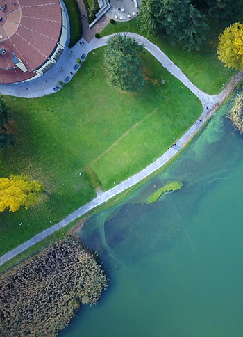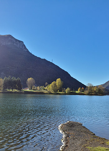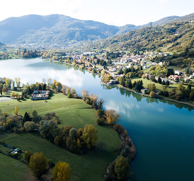 a forma circolare si coniuga armoniosamente con la natura circostante dove le montagne si riflettono nel magico specchio d’acqua del lago di Endine, chiamato anche il lago verde